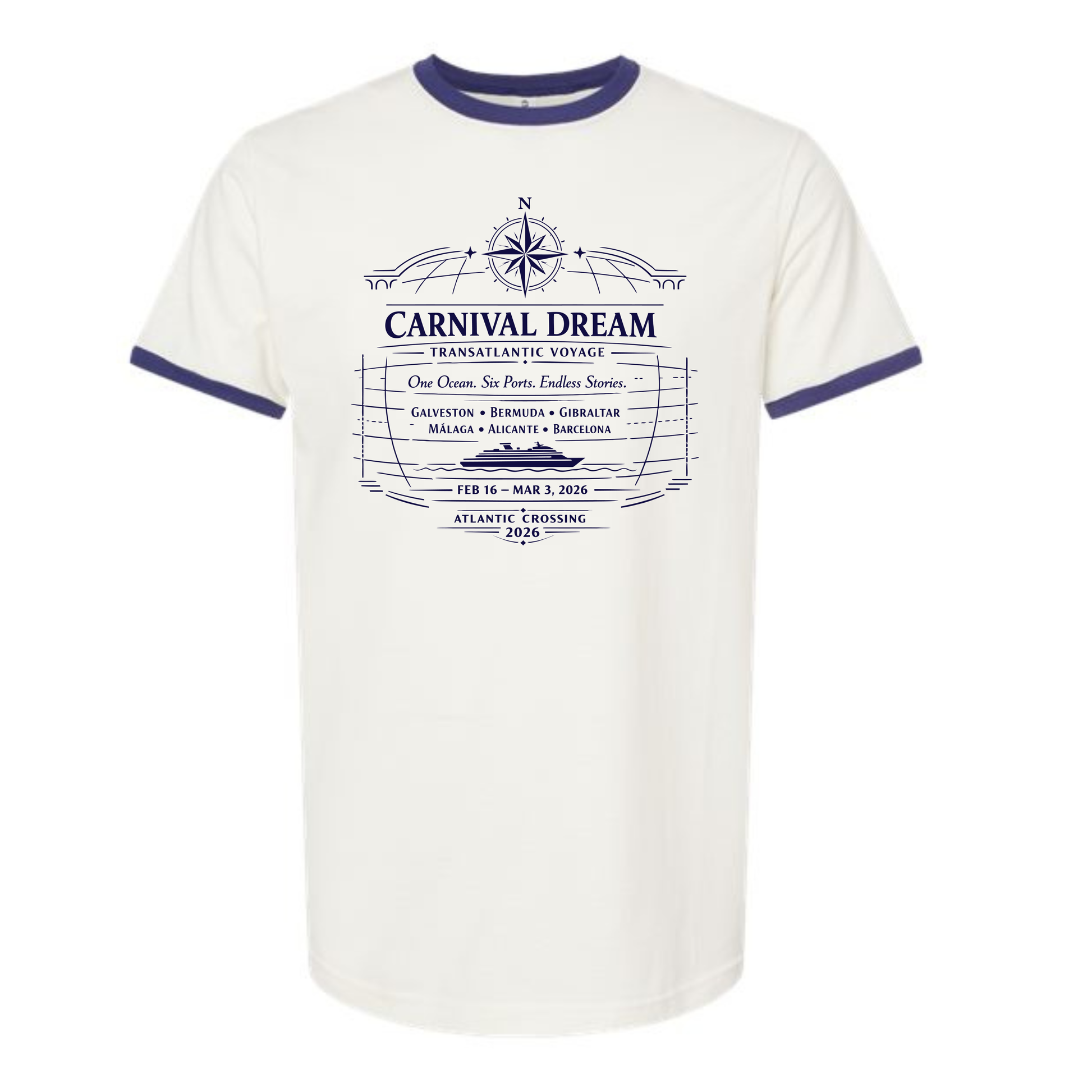 Classic Design - Carnival Dream Galveston, TX to Barcelona, Transatlantic February 16 - March 3, 2026 Cruise Fine Jersey Ringer T-Shirt